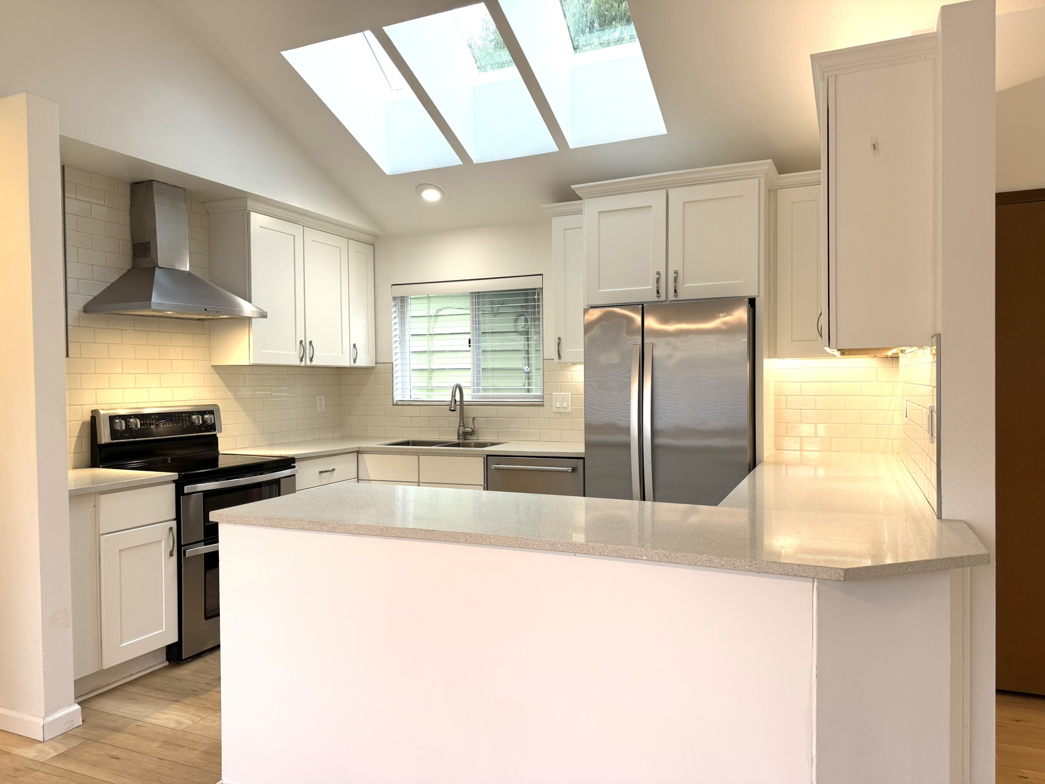 The recently remodeled kitchen is a chef’s dream, boasting premium stainless steel appliances, quartz countertops, a classic subway tile backsplash, and a spacious island perfect for hosting.